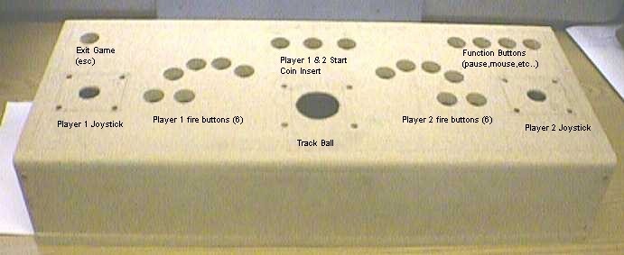 Now that the hard part was done I had to figure out what layout I wanted for the joystick. I looked at many, many layouts and I finally decided to go with a layout that fit my hands while I was standing and sitting them on a flat surface. I wanted two joysticks and 6 buttons per player. I used a layout that made it so player one would move the joystick with their left hand and fire with their right. I did this because that is what I like when I play games, but you might prefer something different. Player two uses their right hand for the joystick. This also helps space out the players too so it's not too crowded. I also wanted a trackball so I decided to put that in the middle and have the escape and other function buttons on the top of the joystick.A quick tip for layouts, use a piece of cardboard to test layouts and find one you like, then trace the button positions onto the board and cut them out. I went through about three different layouts before I decided on the one I'm using.