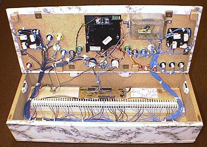 Since I already had to take all the controls off the top so I could work on it, I decided I might as well change the color scheme too. The main reason I did this was because I was talking with my wife about what my cabinet should look like when I eventually build it and she said, "why make it look like all the other ones, make it look like a piece of nice furniture. You should make it out of oak." She also mentioned that white marble would look better with oak than what I had, so I decided to take her advice and make the change. I bought some white marble contact paper from Home Depot and put it on the top and front of my panel just like before. It looks great! Thanks Ellyn!
